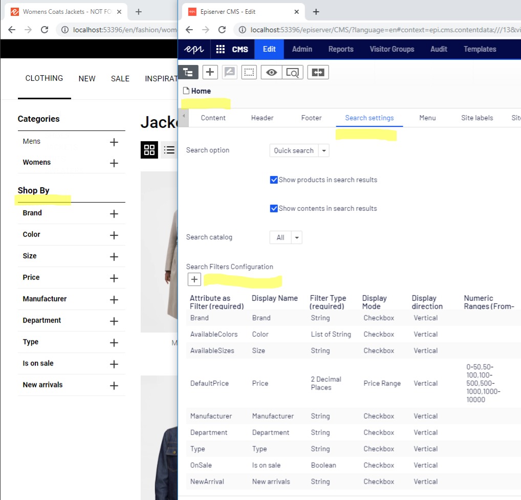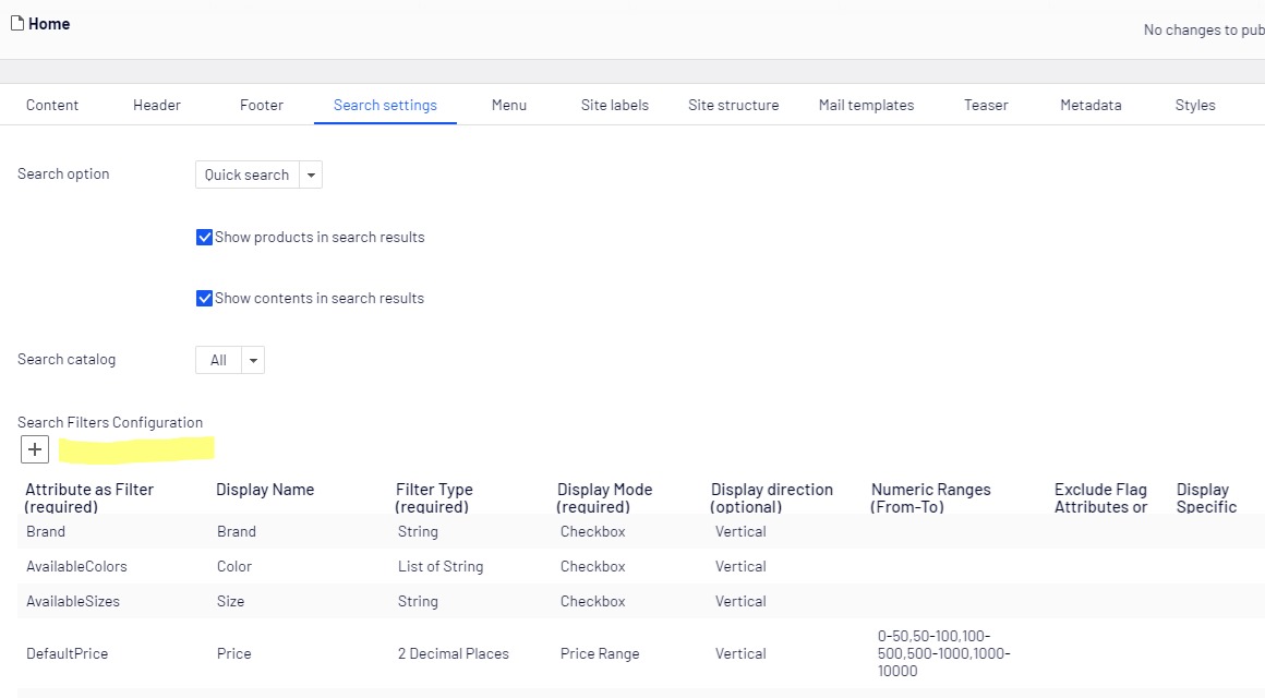 In Episerver CMS > Home page, under Search settings tab, we’ve added a new field called “Search Filters Configuration” that allows content editors to dynamically define and configure the facets displayed on the search results page: