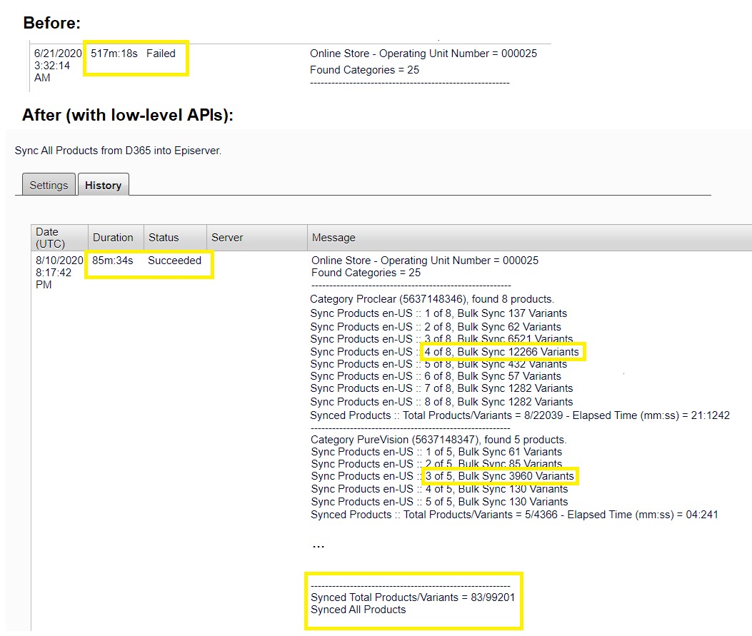 Sync a full online catalog from D365 into Episerver in less than 1.5h (25 categories, 83 products and 99 201 variants in 85 minutes).