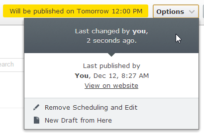 If you select “Schedule for Publish,” you’re asked to enter a time, and the Draft Version’s status becomes “Delayed Publish.” At the appropriate time, a scheduled job changes the status to “Published Version” and it becomes the public version of the content at that moment. The current Published Version becomes “Previously Published.” This also opens up new options, available until the scheduled publish time, which will be discussed below.