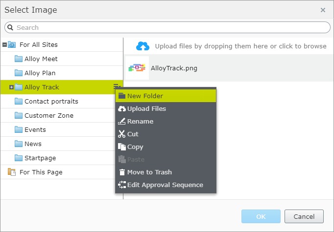 The media selector has much more useful features comparing to the standard content tree widget, which can be used when selecting an image. Editors can change the folder structure, download and edit images, etc. All functionalities of the media component are available.