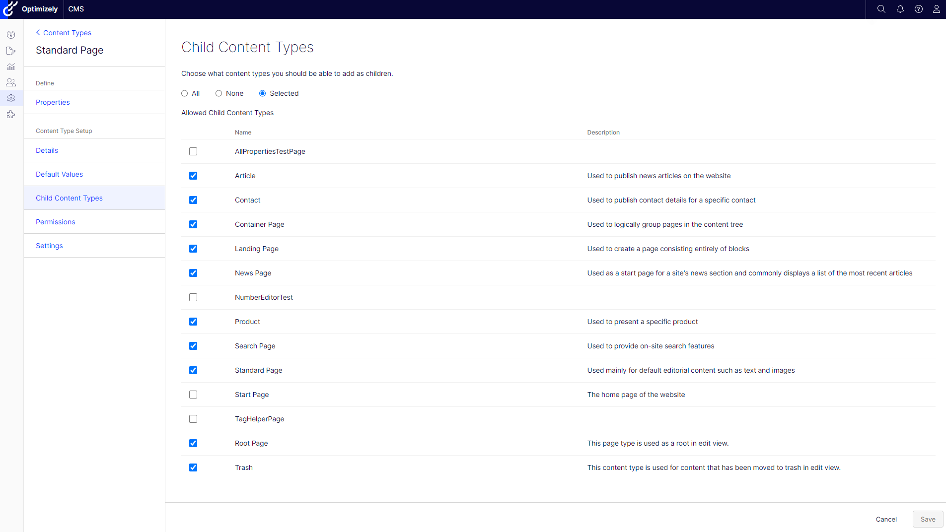 The Child content types section allows you to define which content type instances can be created as children of the content type.