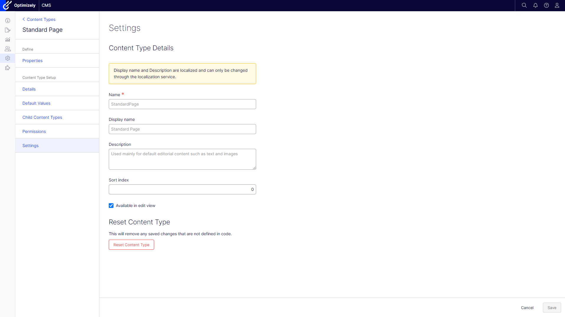 The Settings section allows you to configure basic content type properties. Some properties cannot be set when they were localized.