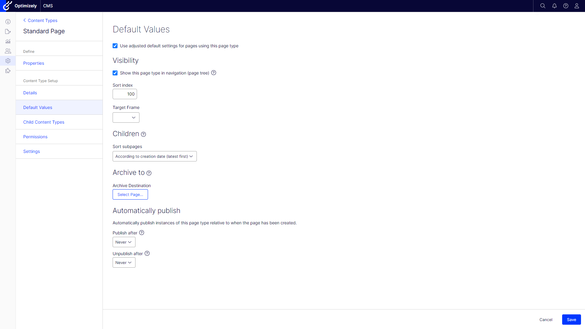 The "Default Values" section allows you to configure default settings for pages, like sort order or publishing rules. This section is available only for Page Types.