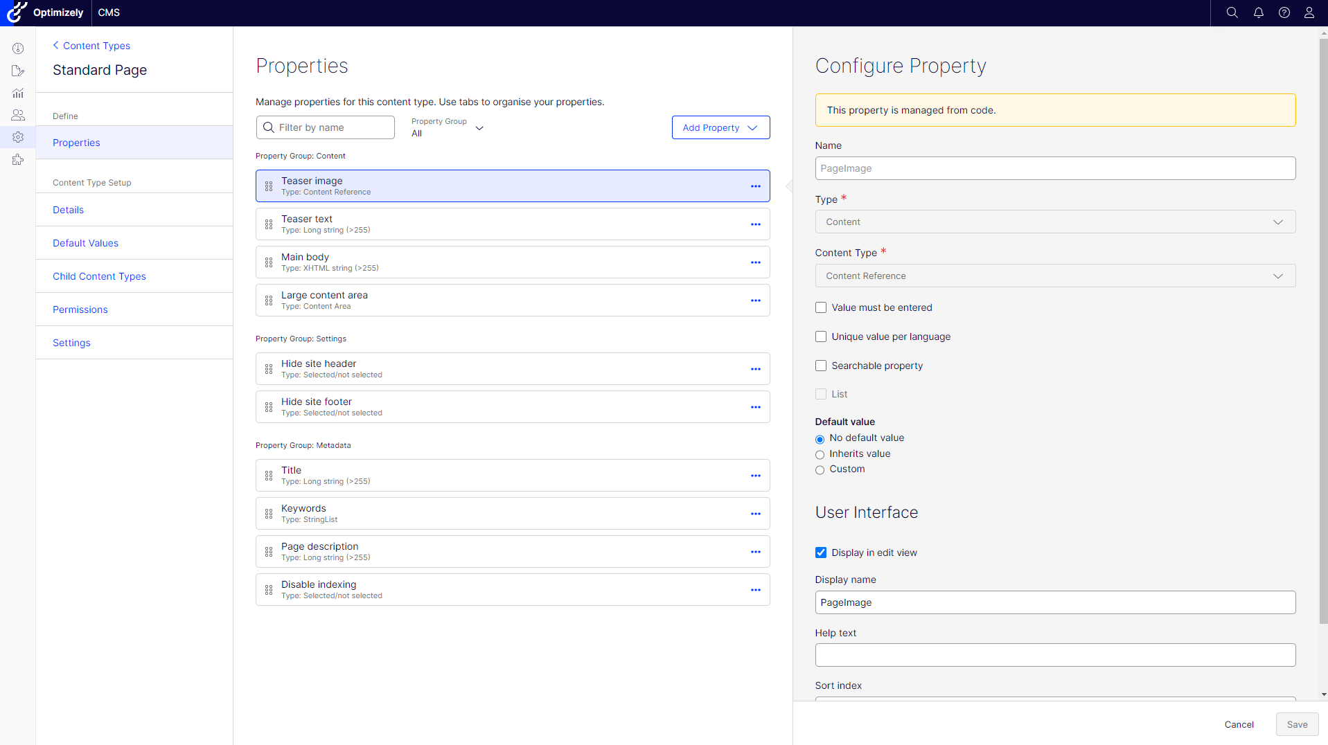 Content types have a lot functionality to configure. We grouped them into a few clear sections: Properties, Details, Default Values, Child Content Types, Permissions and Settings. I will describe them one by one.