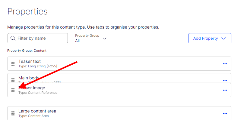 In the previous version, reordering properties was done with the "Sort index" input field on property details form. Administrator can still use this functionality, but now properties can be reordered in easier way by using drag & drop. Additionally, this functionality allows to change the group of the property.