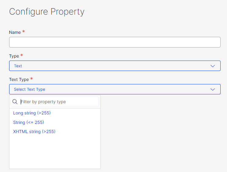 Before, the property definition type selector was a long list of types. Now, in the current version, types are grouped with additional dropdown. For example for Text group we can select Long string, String or XHTML.