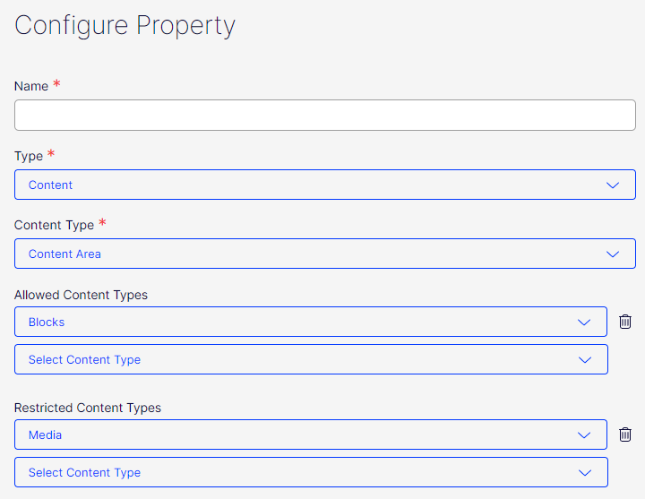 For property types related with ContentReference type, like ContentArea, Content Item etc., an administrator can configure allowed and restricted types.