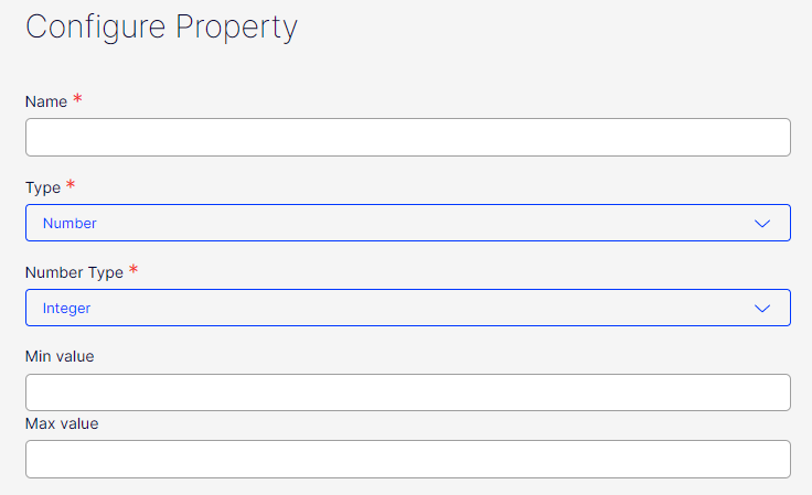 For number property types (Integer and Floats), an Administrator can configure value range by setting minimum and maximum values. Range can be also configured for date properties.