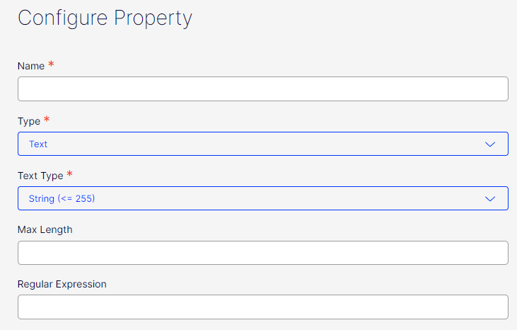 For String property types, an Administrator can configure a maximum length as well as input regular expression validation rules.