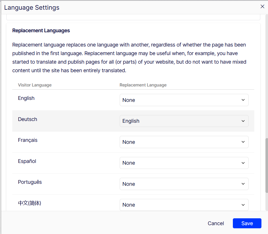 With the above popup, we will be able to configure the replacement language, and Optimizely's out-of-the-box logic will take care of displaying all page content in the replacement language.