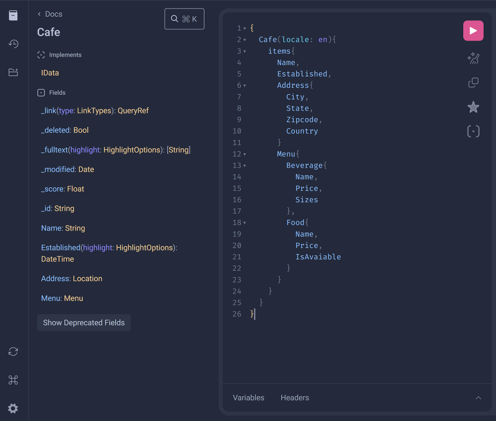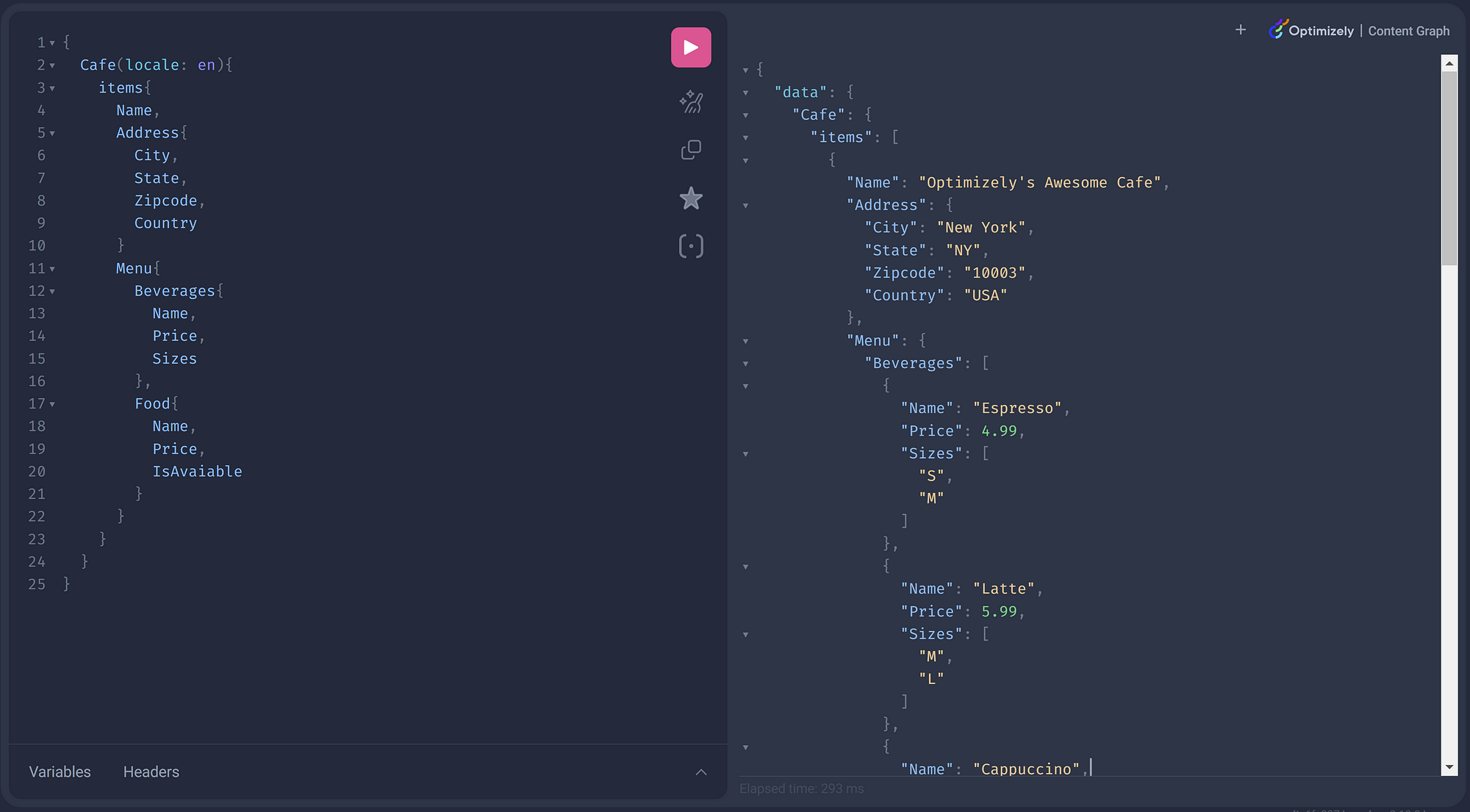 As your content grows — like adding more cafes with unique menus — you can easily query your data using any field or nested field that was configured during setup. For instance, to find the name of a café in Stockholm that serves espresso, you can write a GraphQL query like this: