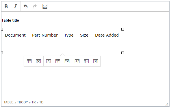 With the template selected the content editor is ready to enter their data. Hey, but what's with that extra toolbar and where did it come from? Well, because the template HTML contains a table, TinyMCE has detected this and has provided us with tools to be able to set the table properties, delete the table, add a new row above the current row in scope, add a new row beneath the current row in scope, delete the current row in scope, add a new column to the right of the current column in scope, add a new column to the left of the current column in scope and delete the current in scope, respectively.