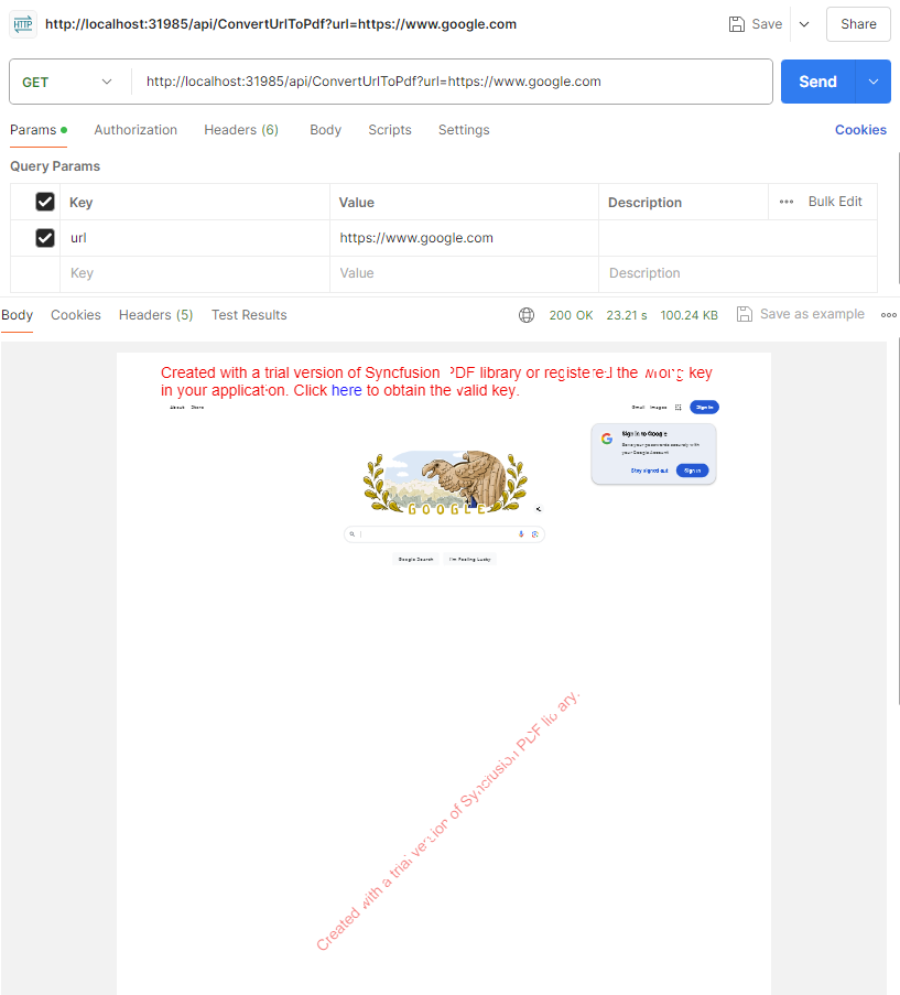 Spin up the container using Docker Desktop. You can use your browser or Postman to test the PDF generation. Append the URL of the site you want to print to the querystring.