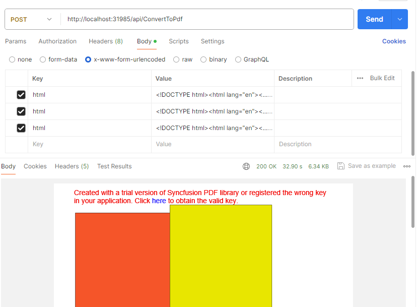 Spin up the container using Docker Desktop. Use Postman to test. POST to the endpoint, providing multiple "HTML" Key-Value pairs. One per page of the PDF