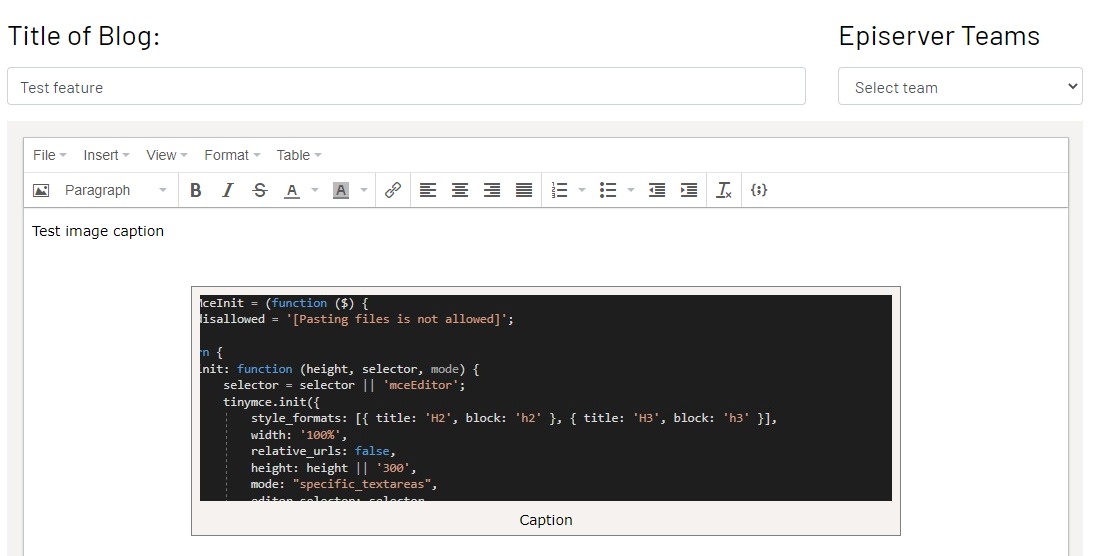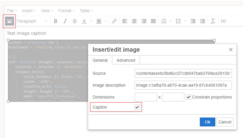 You can add image to the editor by copy + paste / drag and drop / click (+) from Image Manager. Then, select the image and click the Image icon below the Menu bar, then select Caption from openning dialogue: