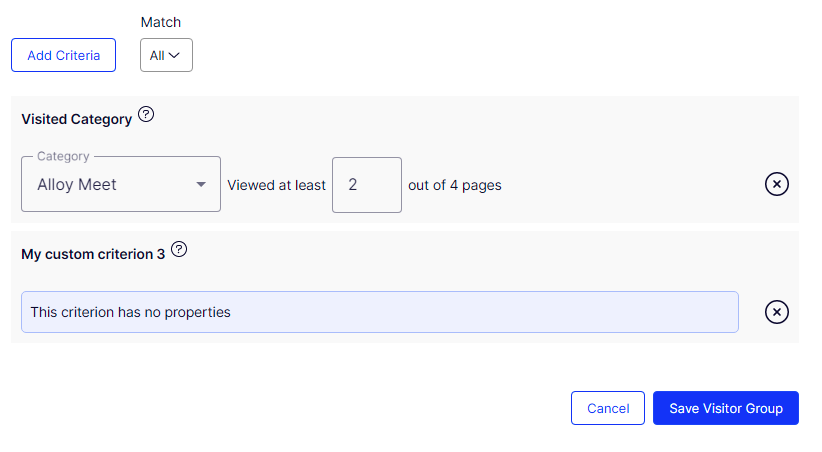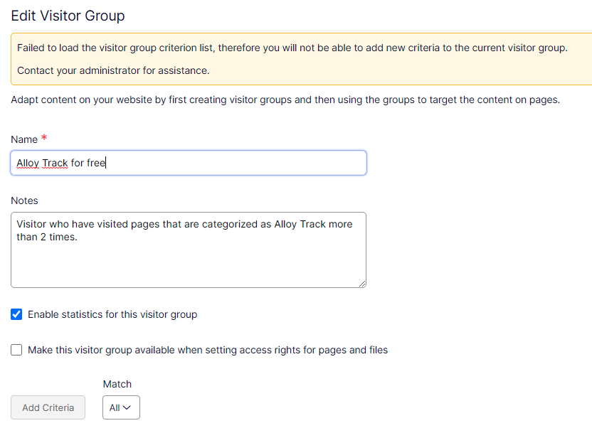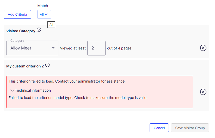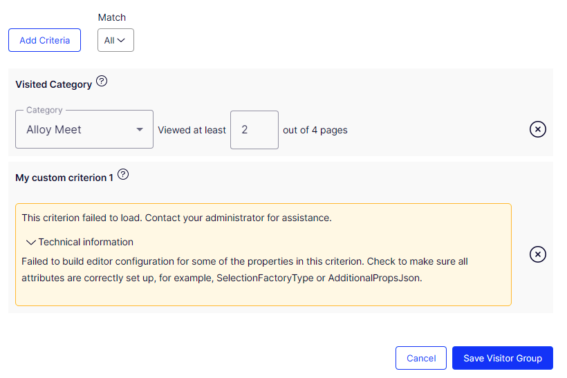 The visitor group list and detailed visitor group page will always be loaded. When the list of all visitor group criteria are failed to load (for example, when one of custom visitor group criterion has exceptions in its constructor), the detailed page can still be viewed, even though users will not be able to add criteria to it