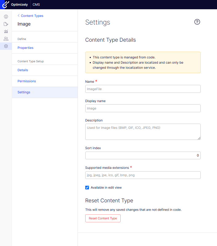 The supported media extension list is displayed in Content type page > Settings. For content types created from code, the supported media extension list is readonly.