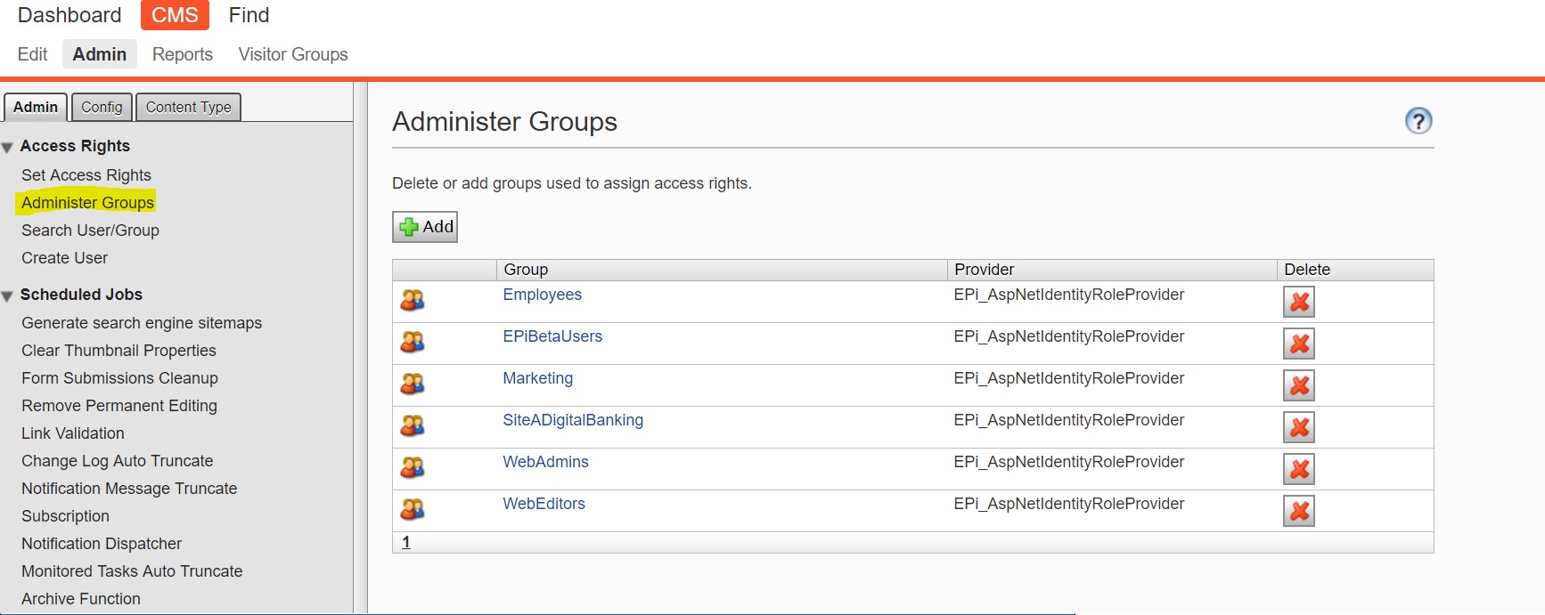 - WebAdmins: can access both admin and edit views and the administration interfaces for add-ons and visitor groups oes not provide editing access in the content structure by default.