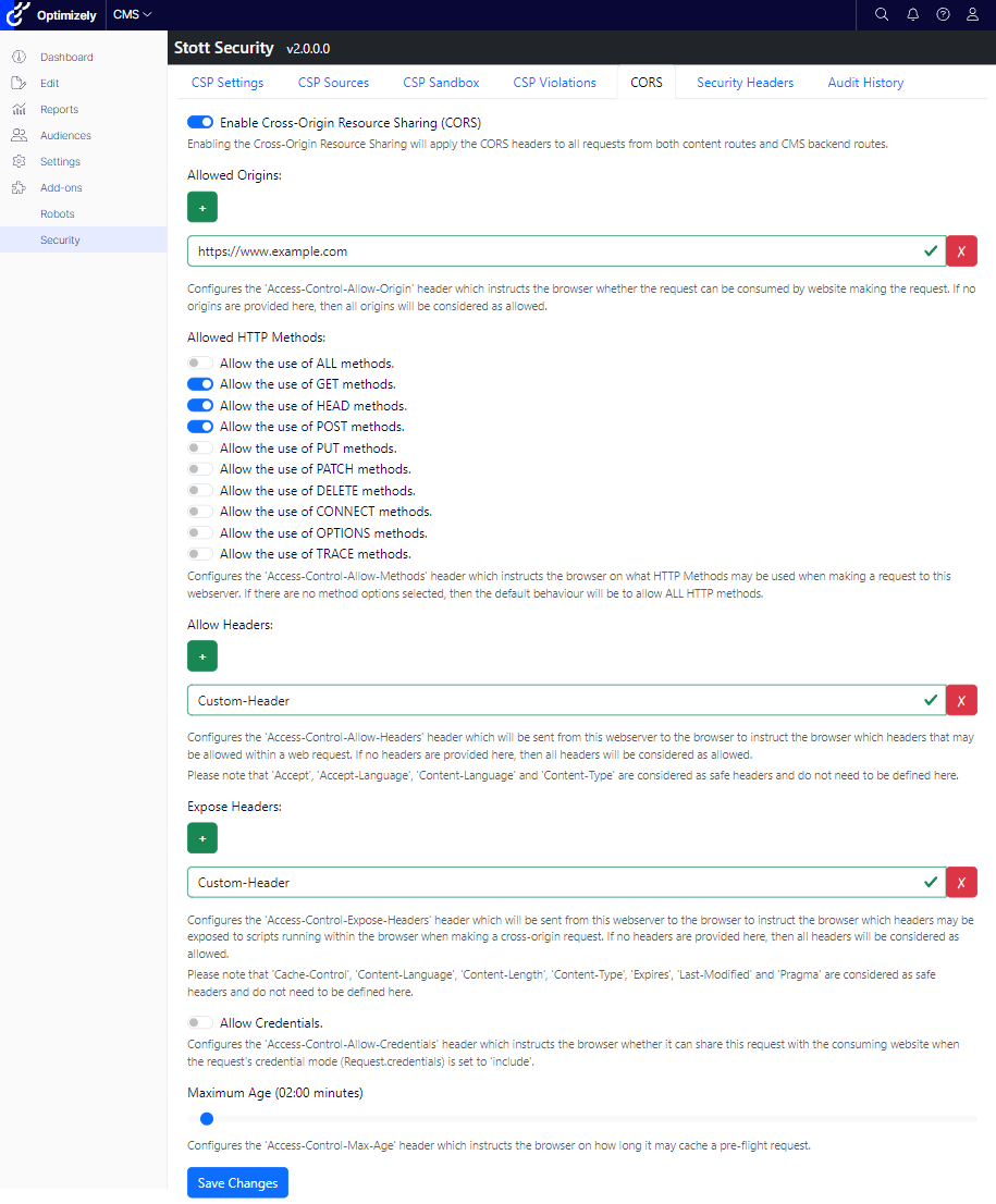 For further insights into the original CORS implementation within Stott Security, refer to Adding CORS Management to Optimizely CMS 12. Notably, this functionality has been updated to accommodate both fixed CORS policies in the code and the globally utilized policy by Stott Security.