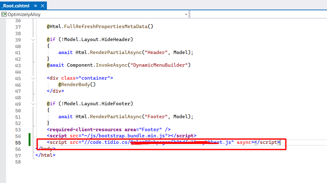 Find the main layout file of your website. This is usually where you want to add third-party scripts, as it ensures the script is loaded on all pages. For simplicity, I’m using the Alloy theme and adding it in the Root.cshtml file. Note that This placement is recommended to ensure that the script loads after all other content, reducing the risk of blocking page rendering.