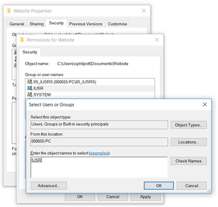 Right-click on the root folder of the website, select Properties and the Security tab.