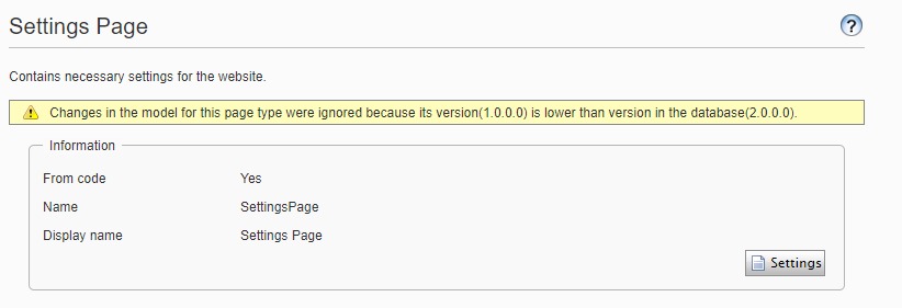 Changes in the model for this page type were ignored because its version (1.0.0.0) is lower than version in the database(2.0.0.0)