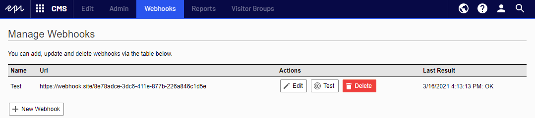 At February’s Developer Happy Hour I demonstrated an add-on I’ve been working on which adds webhook functionality to Episerver / Optimizely CMS solutions and I’m pleased to announce that it is now available via the Episerver NuGet feed. After installing the add-on, an additional “webhooks” menu item is added to the CMS navigation for users with admin access which links to the webhook UI. The UI allows for webhooks to be created, tested, updated and deleted as well as allowing for an at-a-glance view of the last result for each webhook. Clicking on the last result pops up the full response received, allowing for easier debugging.