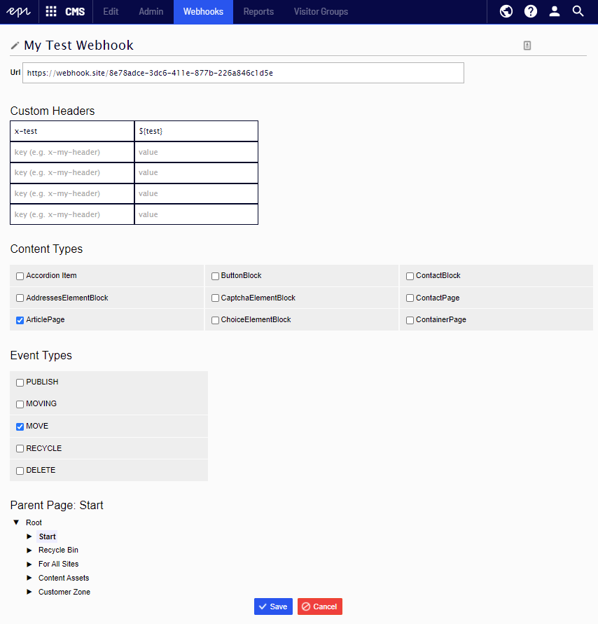 You have the option to select one or more content types so that the webhook will trigger only on events involving content of the selected types. Leaving this blank defaults to triggering on all content types (assuming they’re in the correct part of the tree). Should you require, you can also add up to 5 custom HTTP headers which could be used for sending authentication information, keys or any other additional information your receiver may require in the header.