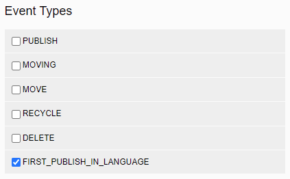 Reloading the screen, we can now see our friendly event name in the list of events and use it to fire a webhook the first time a content item is published in a given language.