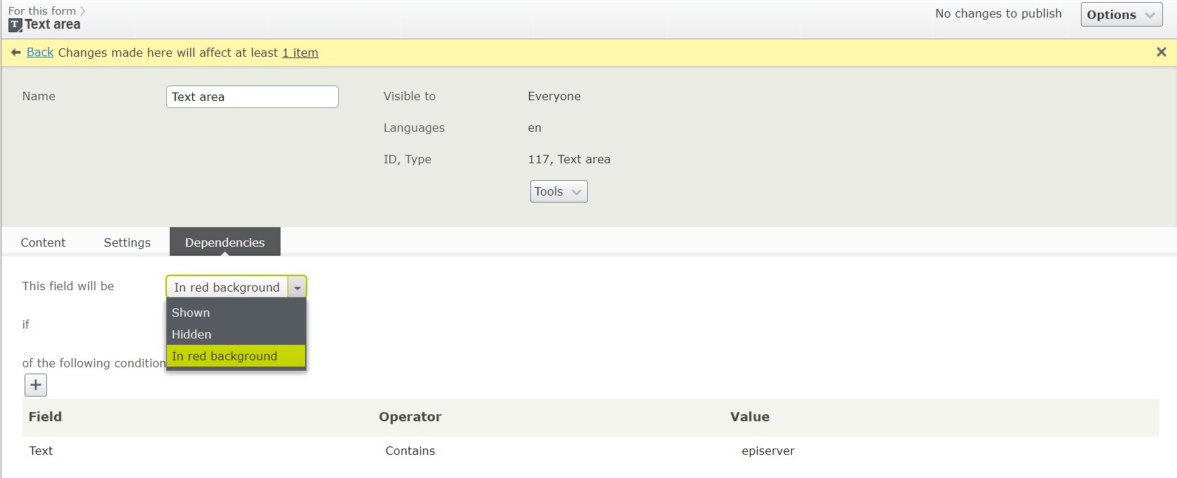 Let's rebuild your project, create a form with two fields: Text and Textarea. On Dependencies tab of Textarea element, the new action is listed. Select the newly created In Red Background action. The background color of Textarea element will be changed to red if the value of Text element contains episerver
