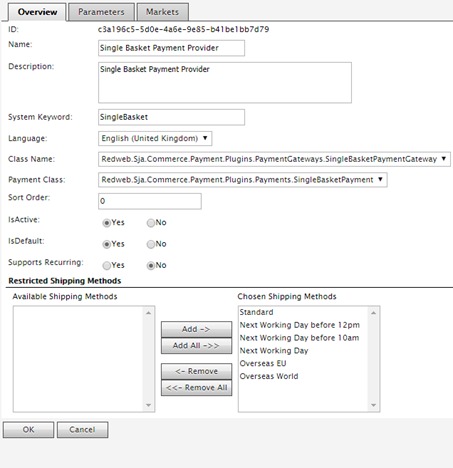 Once created and the app pool restarted you can create a payment provider in the admin using the classes created. Below is an example for a custom payment gateway we created that works with Smartpay and Pay On Account across multiple different catalogues. You can also restrict what shipping method are support for a gateway as shown below.