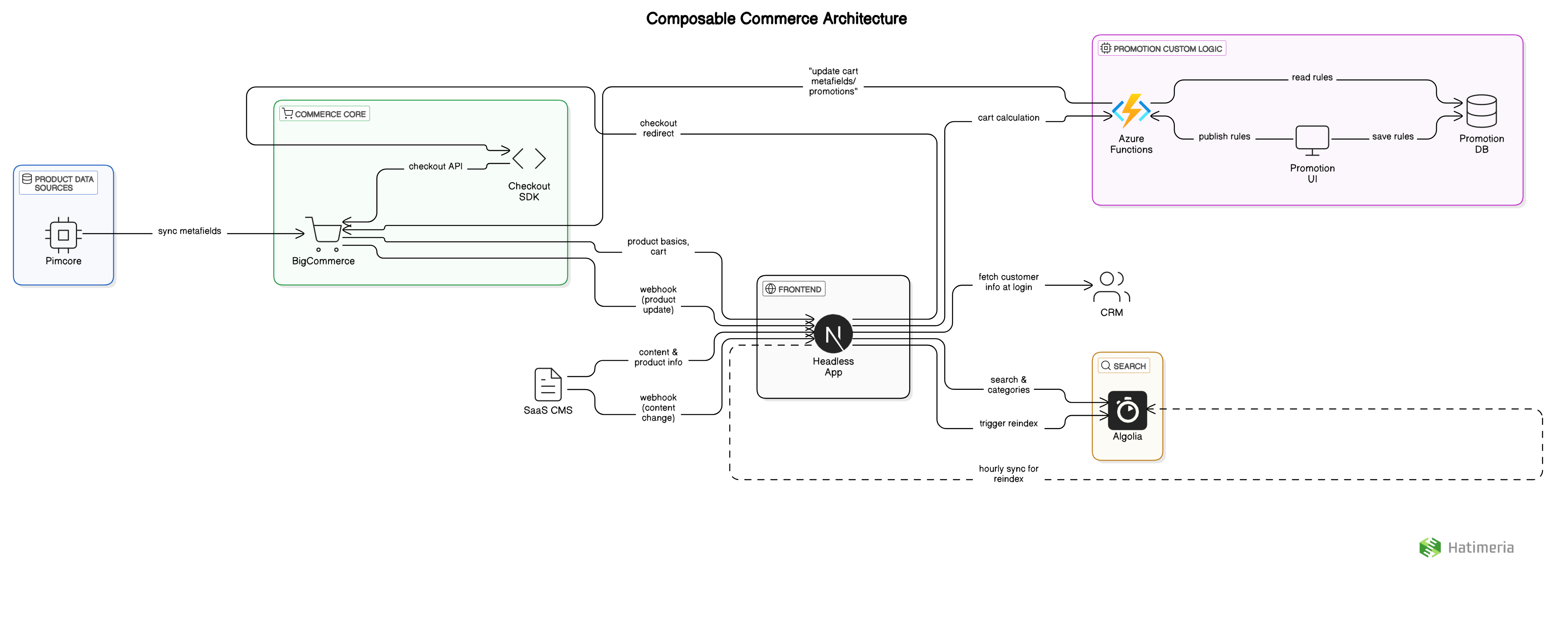 Headless App (Next.js): Orchestrates frontend - content from CMS, products merged via SKU from BigCommerce + CMS, search from Algolia, cart/promo logic via Azure. Checkout handled on separate domain via BigCommerce SDK.