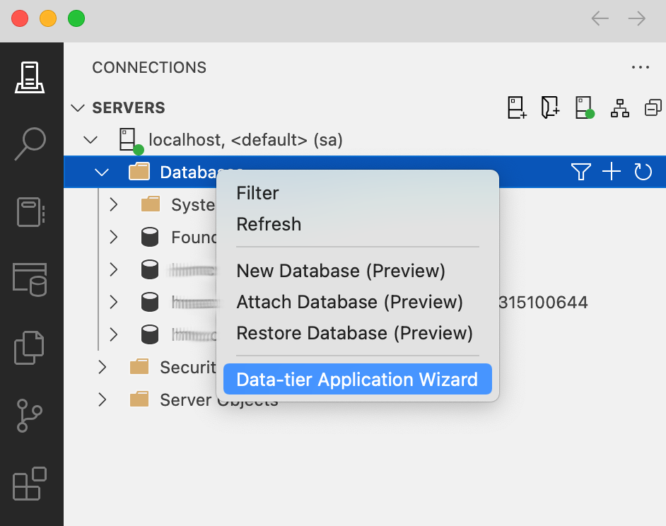 version: "3.9"services:mssql:image: mcr.microsoft.com/azure-sql-edge/developercontainer_name: "mssql"environment:ACCEPT_EULA: "Y"SA_PASSWORD: "MySecretPassword"ports:- "1433:1433"volumes:- ./data:/var/opt/mssql/data- ./log:/var/opt/mssql/log- ./secrets:/var/opt/mssql/secretsStart the container with SQL database by running