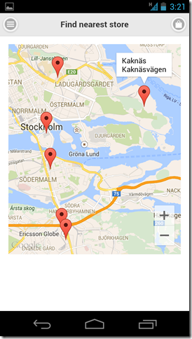 Before adding a map to the application, we need to query all stores locations from the server first. The server will return an array of store, and its location (latitude and longitude). Based on those locations, we add a marker to the map for each store. Please note that this feature is not a part of the Service API.