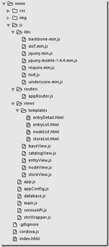 Our code base is in the www folder, everything else is Cordova’s stuff. Unless if we want to customize the Android configuration, we can check the platforms/android folder.