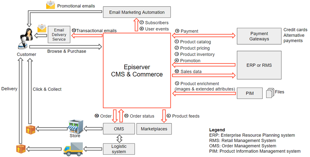 When implementing an Episerver CMS solution, integration with external systems is not always required. However, I have not seen any Episerver Commerce implementation that can go live without integration. The following diagram depicts a typical B2C Episerver Commerce implementation which has multiple integration touchpoints with various external systems.
