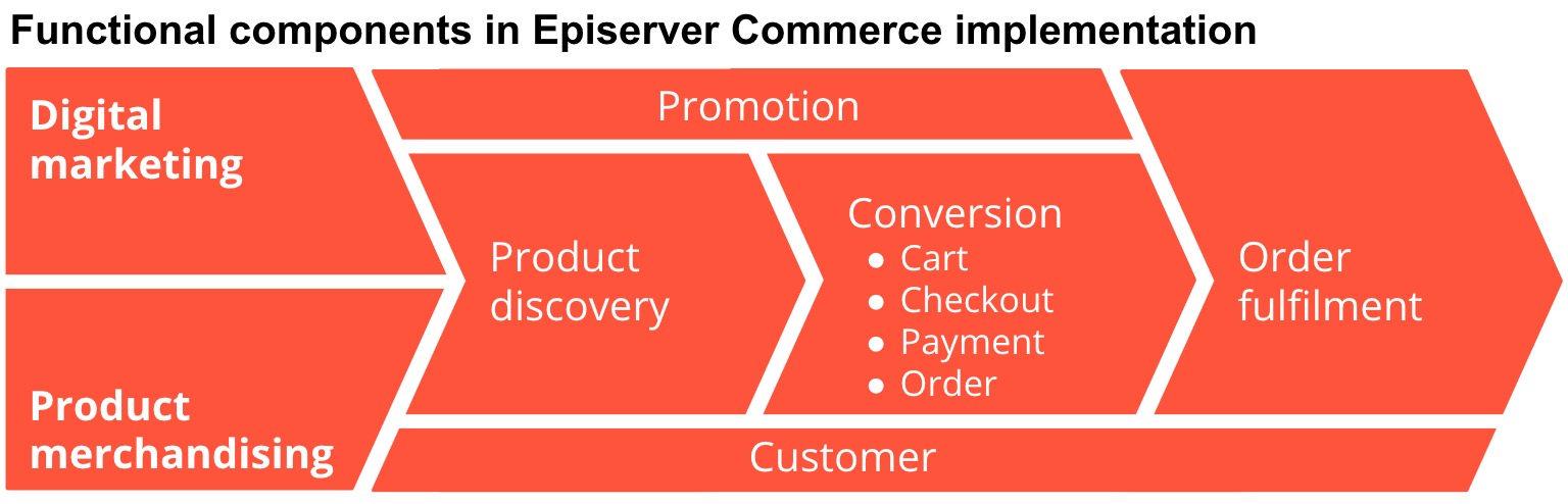 As discussed above, out of 7 functional components in a typical Episerver Commerce implementation, digital marketing and product merchandising functional components can be overshadowed by explicit transactional ones namely customer, product discovery, promotion, conversion and order fulfilment. Therefore, it is important for developers to pay attentions to digital marketing and product merchandising to ensure business requirements are fully captured and implemented using available Episerver Commerce building blocks.