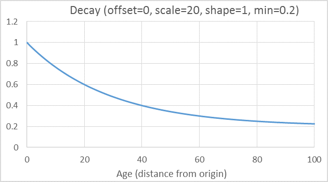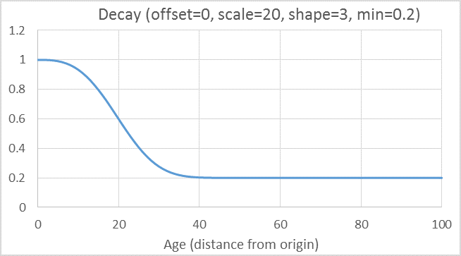 You can also affect decay by setting the decayShape parameter. This is equivalent to setting the k-value in the Weibull cumulative distribution used to calculate decay in auto boosting. By default, the shape is set to 1.0, which makes it equivalent to exponential decay. The shape can range from a more rapid decay (k < 1.0) to more sigmoidal one (k > 1.0).