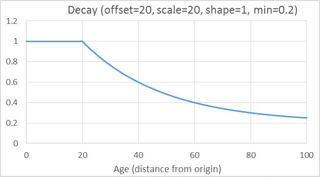 Decay is measured from a fixed point in time that you can set using the decayOrigin parameter. By default, this is set to the time of the request. All dates after the origin are limited.