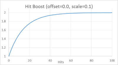 To control the rapidity of the decay, set the hitBoostScale parameter, which sets the half-life, where the boost is at 50%. By default, hitBoostScale is set to 0.1 (10%). Lowering the scale makes the inverted decay more rapid. If you set a value higher than 0.1, it leads to cut-off where the hit boost cannot reach the upper range limit.
