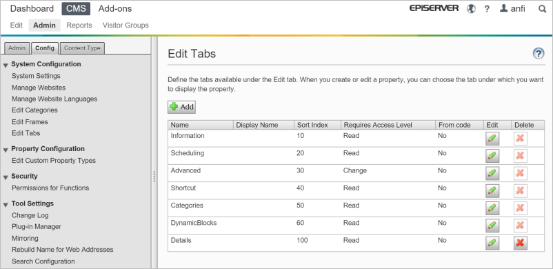 The Content and Settings tabs are available by default. Tabs can be edited from the CMS admin view. From here you can also define access levels, to create tabs with properties that are only available for selected editor groups.