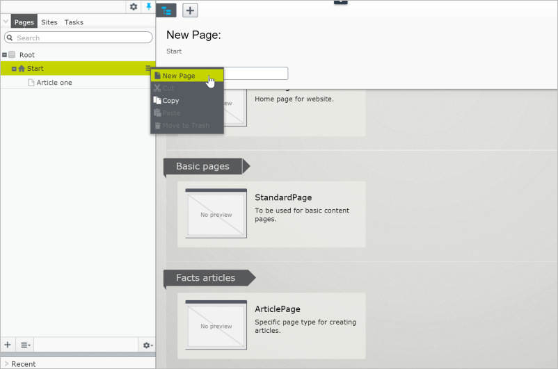 Example: Here we have two page types - StandardPage and ArticlePage, belonging to the groups Basic pages and Facts articles respectively, where the Basic pages group will be displayed first since it has the lowest sort order.