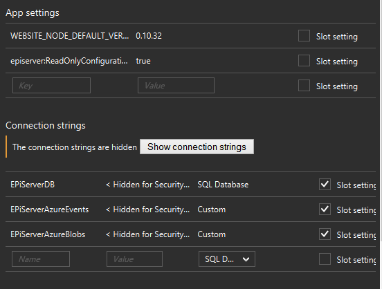 Note: Defining EPiServerDB as a connection string in the Azure Portal requires at least EPiServer.CMS.Core 8.3.0. You must enable this feature by adding an app setting episerver:ReadOnlyConfigurationAPI in the portal, with the value set to true.