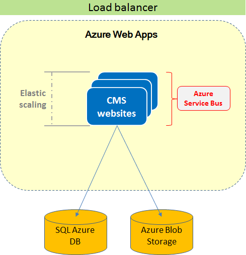 The following image illustrates a CMS website running in an Azure Web Apps environment with multiple instances. The website instances share the same SQL database and BLOB storage that stores binary file data in the cloud environment. The sites are load-balanced, and a Service Bus manages events between the CMS websites.
