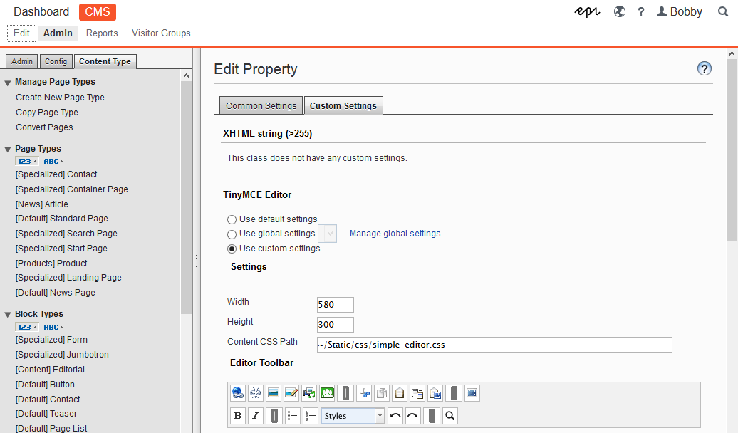 To customize the TinyMCE editor through code, see Property settings.