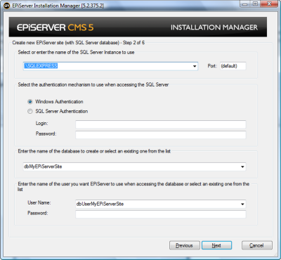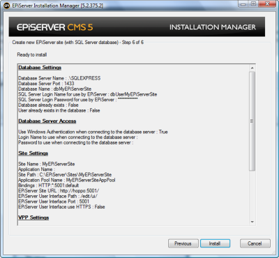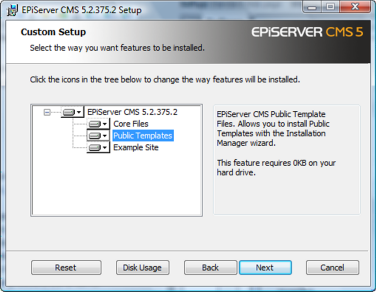 The EPiServer CMS 5 R2 installation comprises of EPiServer CMS 5 R2 assemblies and various components for installation of Web sites. The Express Installation is a "one click installation" scenario - making it very quick and easy to install a first version of EPiServer CMS.