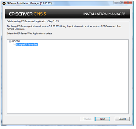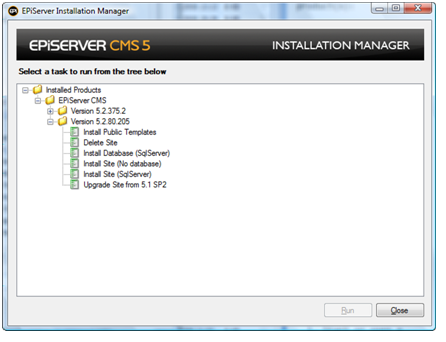 When opening the EPiServer Installation Manager the different versions of EPiServer CMS currently installed on your machine will be listed. The EPiServer Web sites currently on the machine will be listed under the relevant version of EPiServer CMS. Select the task you wish to perform on a listed Web Site and click on the Run button.