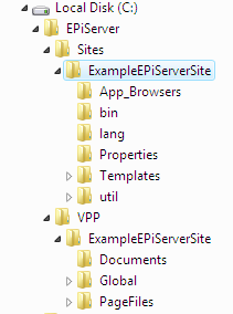Selecting an "Express" installation will create a sample Web Site on the local machine without dialog interaction. The file structure of this Web Site should be similar to the image below. The EPiServer CMS 5 R2 installation file structure is described in the section EPiServer Structure On Disk.