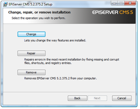 If you wish to change, repair or remove the EPiServer CMS 5 R2 installation then click on the Setup.exe file and then Next. The Dialog below will then appear. Click on the appropriate button.