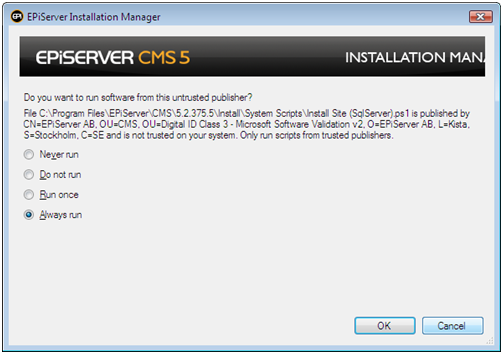 In order to get a running site a new tool called EPiServer Installation Manager (EPiServerInstall.exe) is used. This tool launches Windows PowerShell and executes one of several predefined scripts. The idea is that we want a script based configuration of the site since it is easier to maintain over time and also provides a way for partners and customers to customize the way an EPiServer site is created / deleted or how an EPiServer module is applied. Modules packages e.g. Public Templates which comes with a default EPiServer CMS installation can provide their own logic to be executed by the installer. EPiServerInstall can be run in interactively or from the command line. When launching it without parameters it will show a UI presenting all available scripts to execute for each individual version of EPiServer CMS.